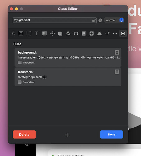 The first class I’ll create is the actual gradient class (my-gradient), I’ll assigned a gradient background fill to this class and also a transform with rotate at 0 and scale at 3.