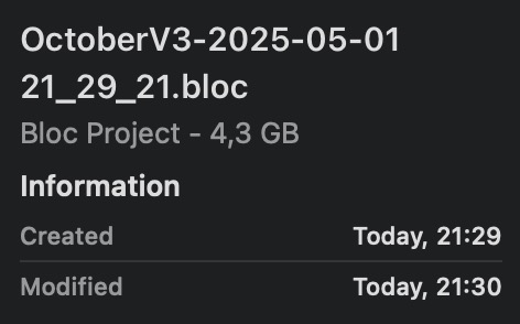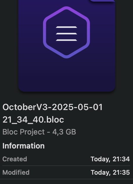 Opened one of these projects. Did one edit and saved the project. Closed it. Re-opened it and then Blocs started building this huge backup file again. Got this 4.3 GB backup file again.
