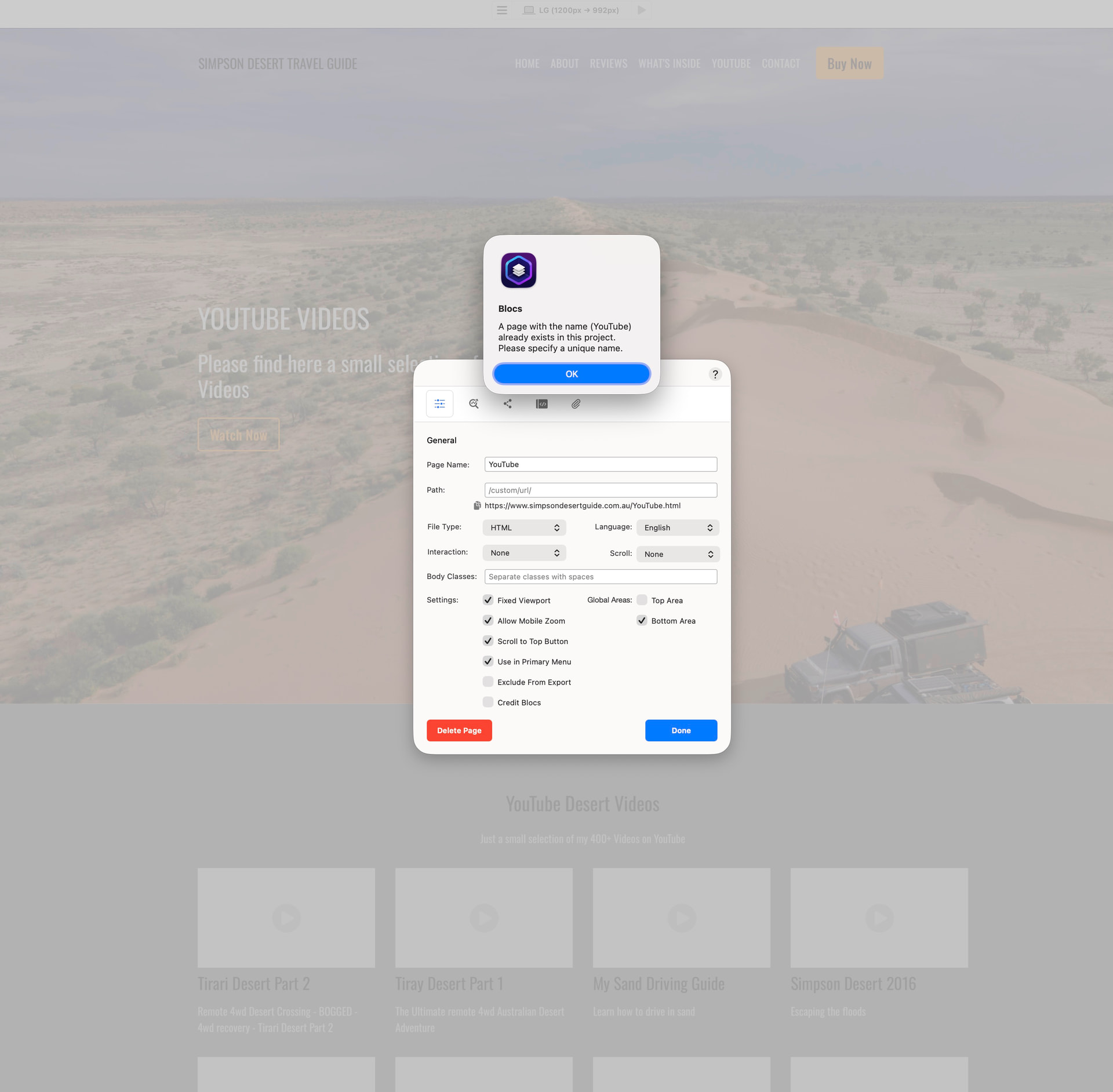 A page with the name (YouTube) already exists in this project. Please specify a unique name.
