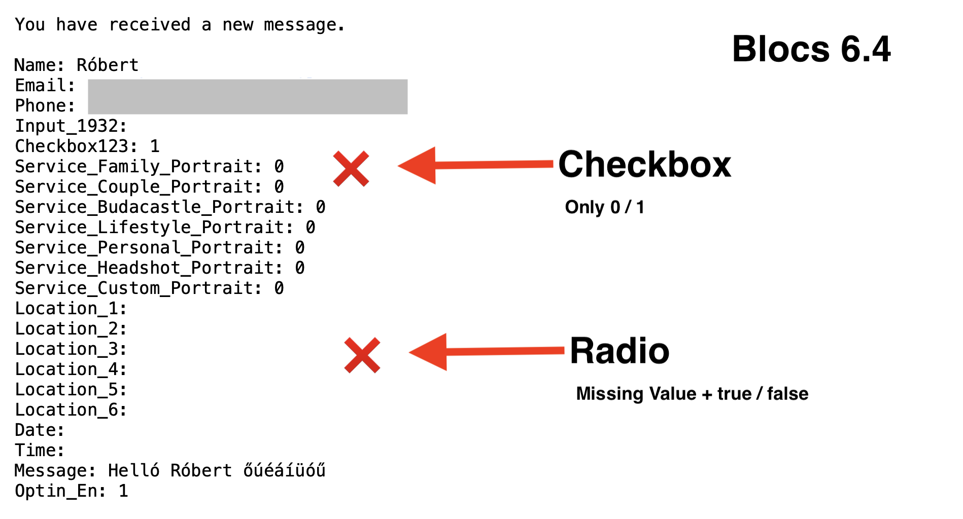 @AdieJAM I’m using the simplest self-hosted Standard PHP Mail post type. The messages are being sent with either 0/1 values or missing values entirely for the radio groups.