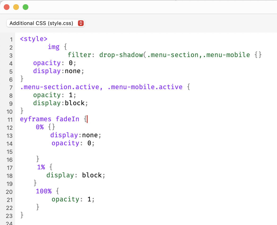 and I am not sure how the display: none ended up in the key frame either. The class names are missing from the first one (where the style tag and img tag appear), it wasn’t even polite enough to add the closing style tag