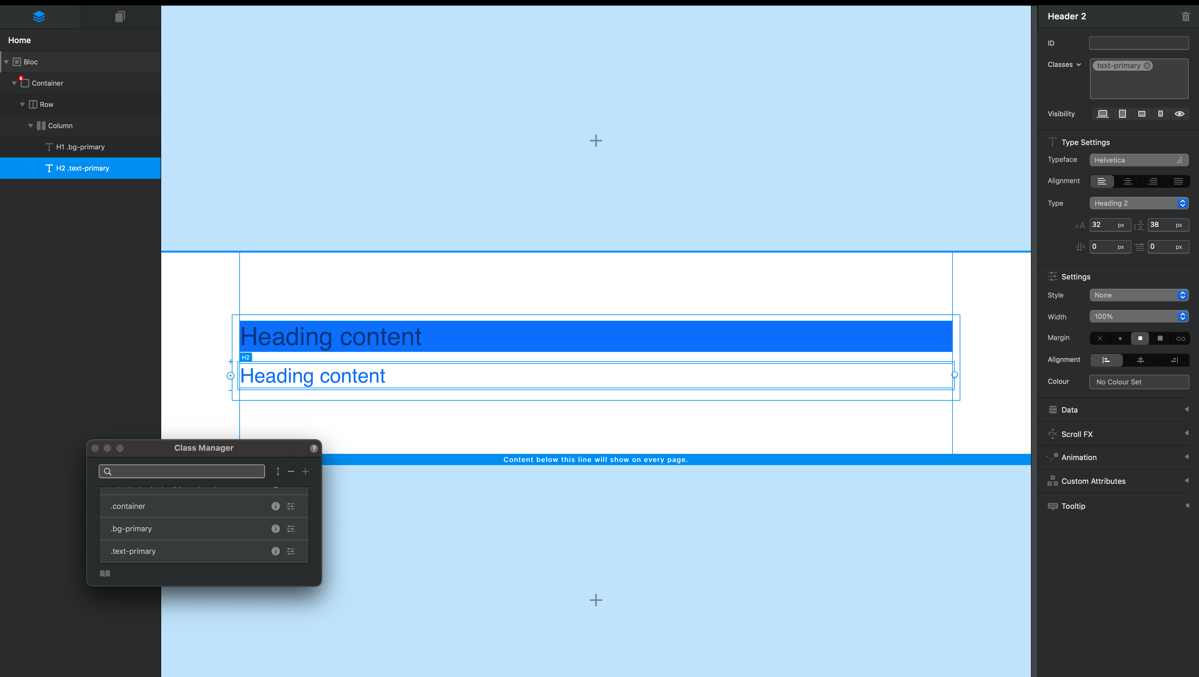 I’d love to be able to set the primary, secondary and all the other colors once. So that when I apply … be it border-primary or text-primary or bg-primary… they all use the primary color that has been set once. The way it works now, I can add the bootstrap class and then use the class editor to change the color for each xxx-primary class on each own.