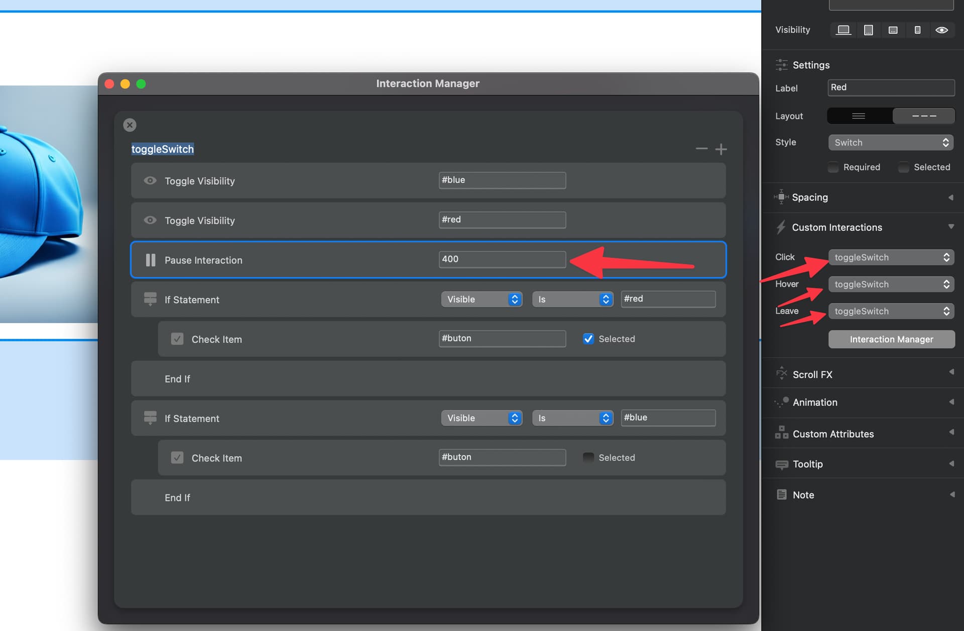 I am encountering an issue with custom interactions. If you take a look at the attached file, I created a small image selector with a ‘selector’ button, and it works very well on hover. However, if I set this selector to ‘On click’, it does not work.