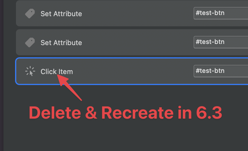 The click selector is different in Blocs 6.4, if you delete this single rule and re-create it in 6.3 it will work again, I just tried that.