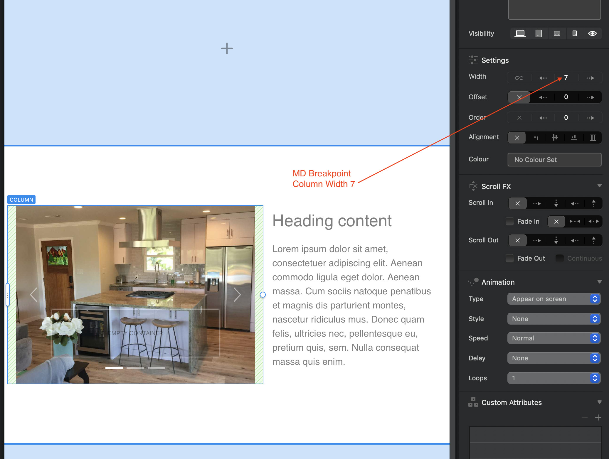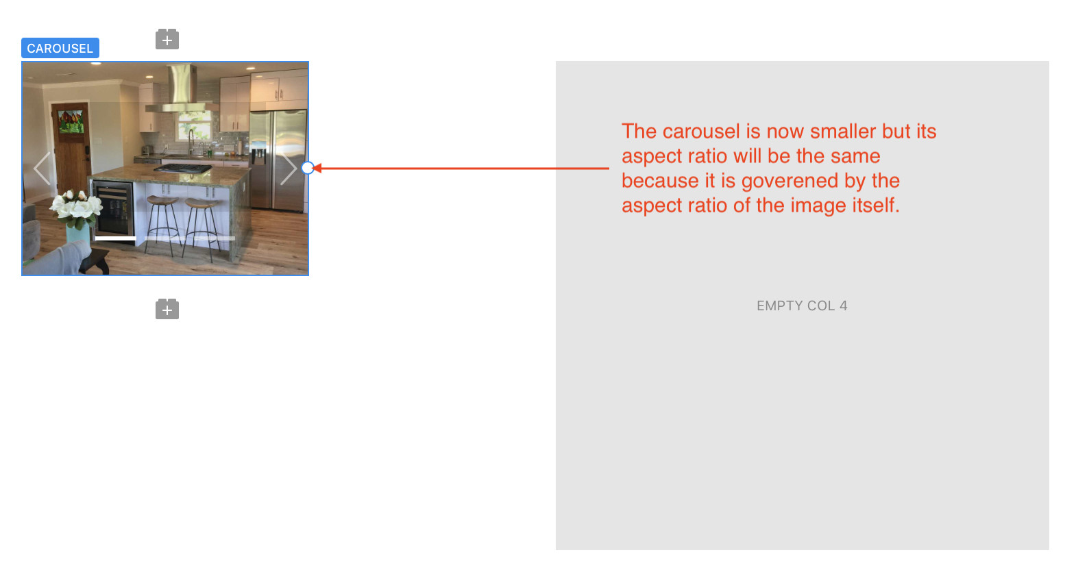 I think you may be overlooking the fact that the size and orientation of Cards, Sliders and Carousels are governed by their content. In the case of a carousel, the carousel itself will always expand or shrink to fit the WIDTH of the column containing it. Of course, it is possible to use the resize handles to adjust the width so that it is smaller than the underlying column. However, when you change the width, the height of the carousel will change proportionately to prevent distortion of your images - this is particularly important if you’re designing across different breakpoints. You can see what I mean below: