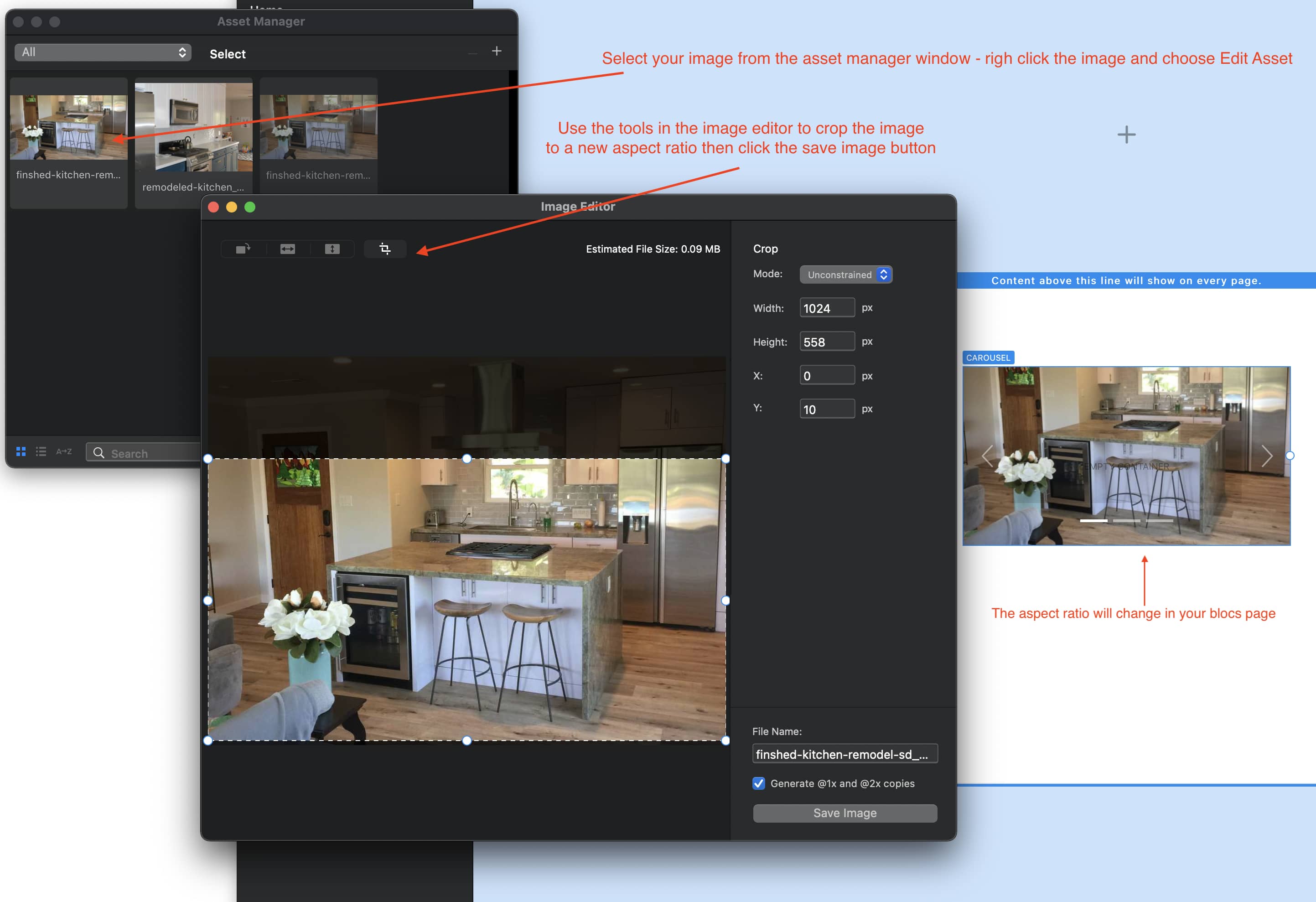 So, to ensure your carousel is consistently sized, make sure that your images in the carousel are consistently sized. To help you, you can use Blocs built in image editor. With this handy tool you can crop images so that they all have the correct aspect ratio. When you make changes, they will be reflected in your project.
