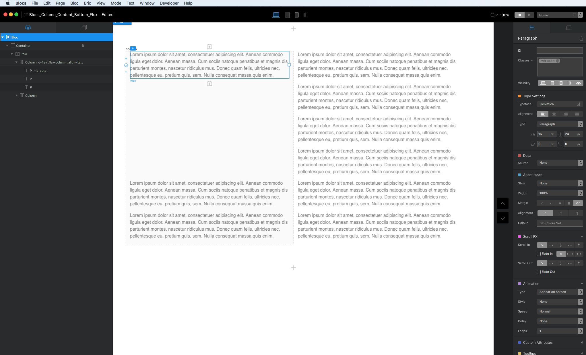 I have 3 paragraphs vertically stacked inside a Column in Blocs. I want the bottom 2 paragraphs to be locked to the bottom of that Column (with a margin of about 20px or so between the bottom paragraph box and the bottom of the Column).