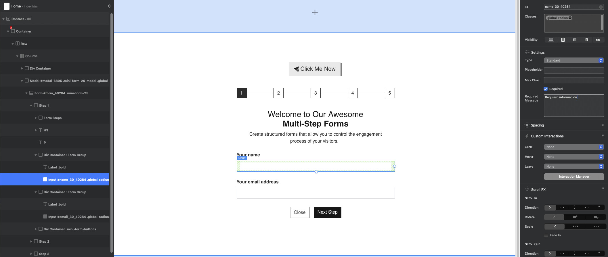 However, when I go to the form’s input and in Settings I want to enable the “Required” option and display a message that the field must be filled in or it won’t proceed to the next step, the message isn’t appearing. I need your help. When I enable the “Required” option, the warning or alert message isn’t displayed in the form.
