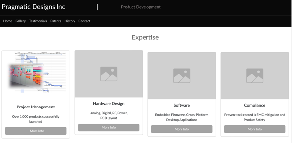 There’s a list of items of expertise on the left, and selecting one of them changes the content of the “pagelet” on the right, allowing visitors to get an overview without having to scroll through a big long page like so many sites or change pages with the main site nav menu.