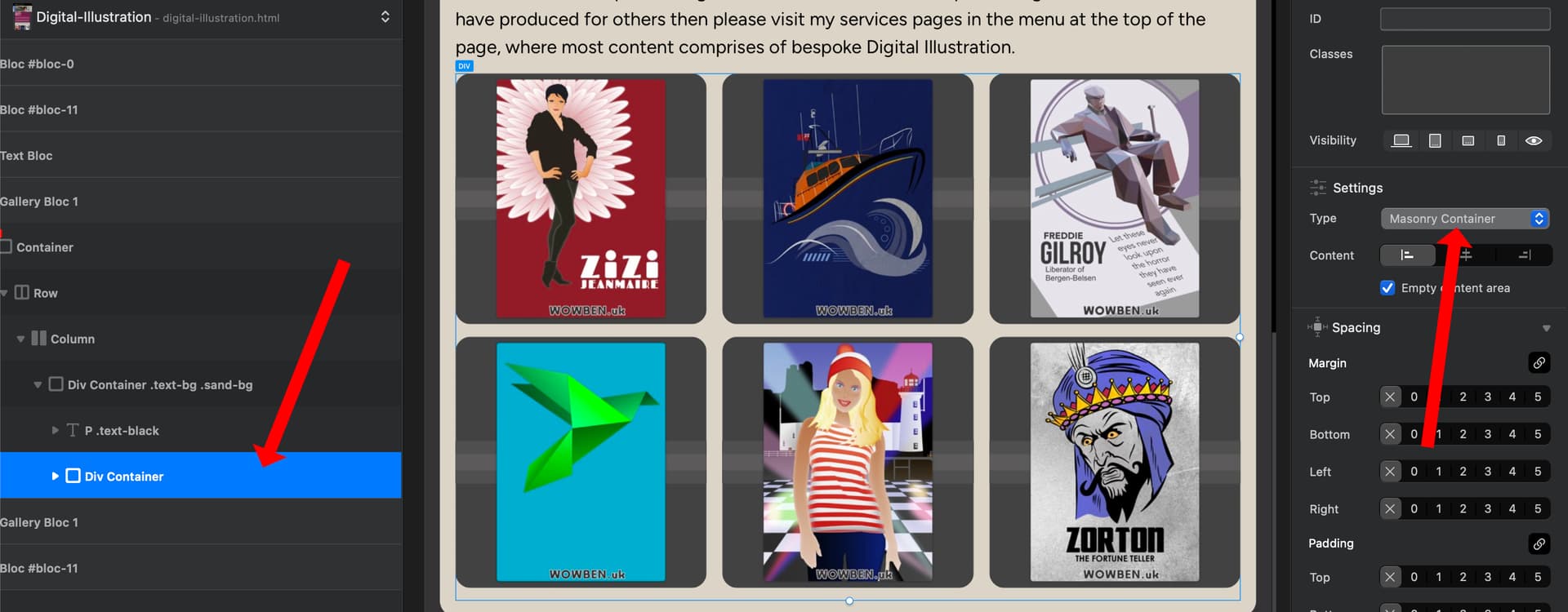 The images I have in the masonary Div below are all square in the screenshot, so not really seeing the masonary effect with irregular ratios. I’ve got that masonary just so that the layout will expand and contract to fit the screen size and I can just keep adding images and not have to change column sizes.