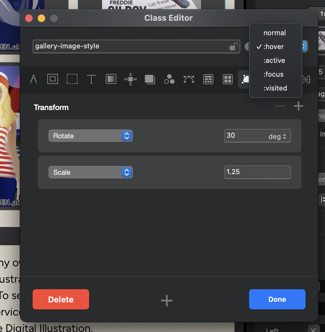 For the hover zoom, you could have the same class assigned to each image and then when hovered using scale etc. (in the screenshot the scale has overflow hidden so is clipped within its image container, if I didn’t have that we would see its full size).