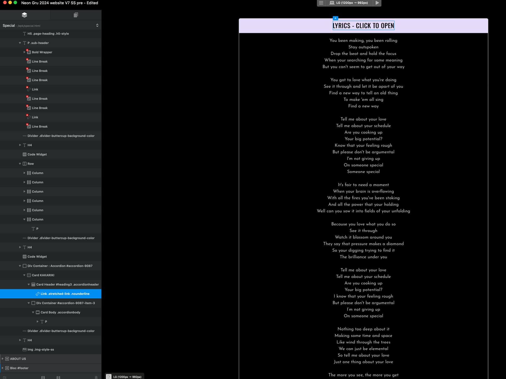 Hoping for help with a lyrics page for my band website. Got accordions with stretched link so it’s easy to open/close by clicking anywhere on the pink header.