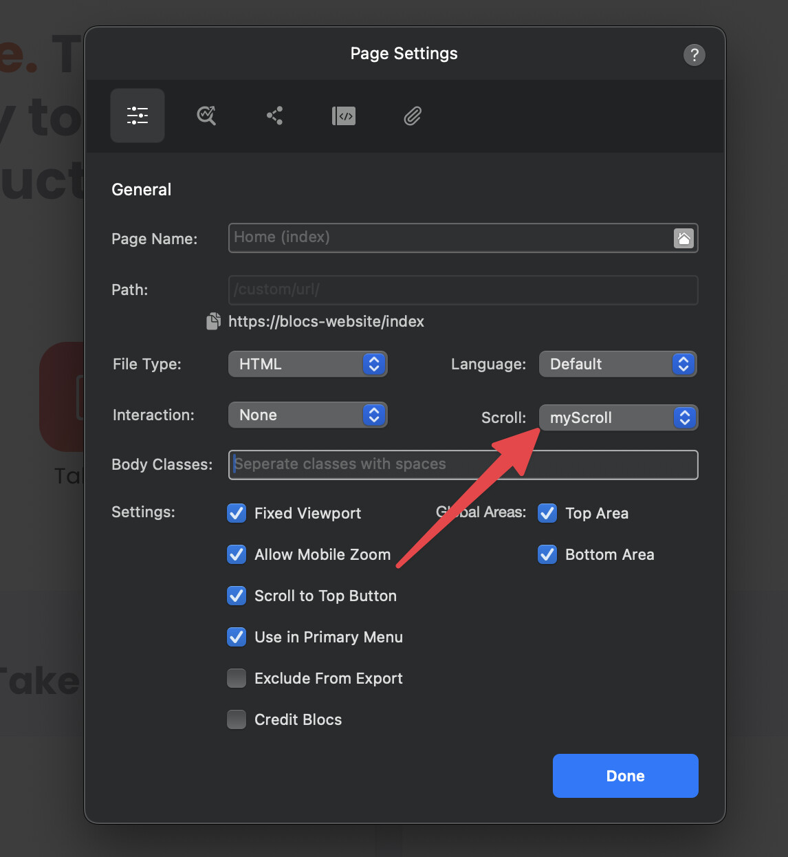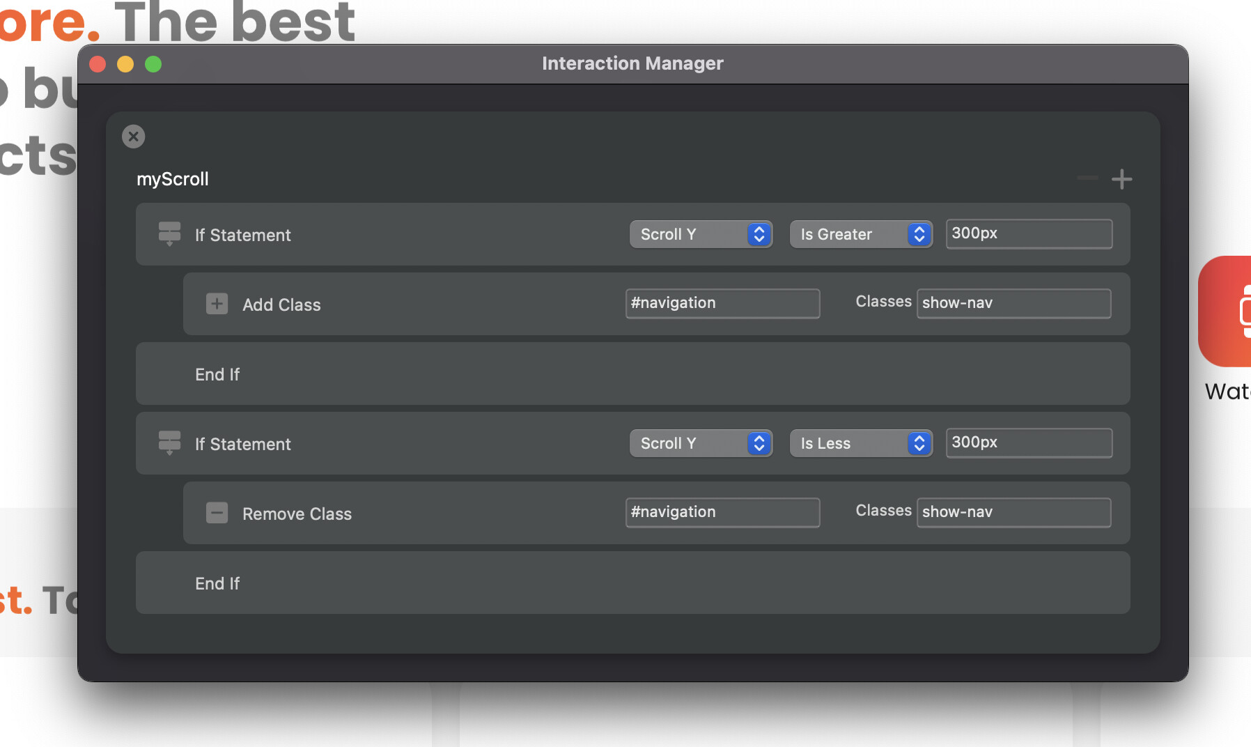 I’ve added a conditional if statement for checking the scroll Y position, you can set greater than or less than and set a pixel value. Inside this you can assign the rules you want to trigger, in my case it’s to add a class to show the navigation.