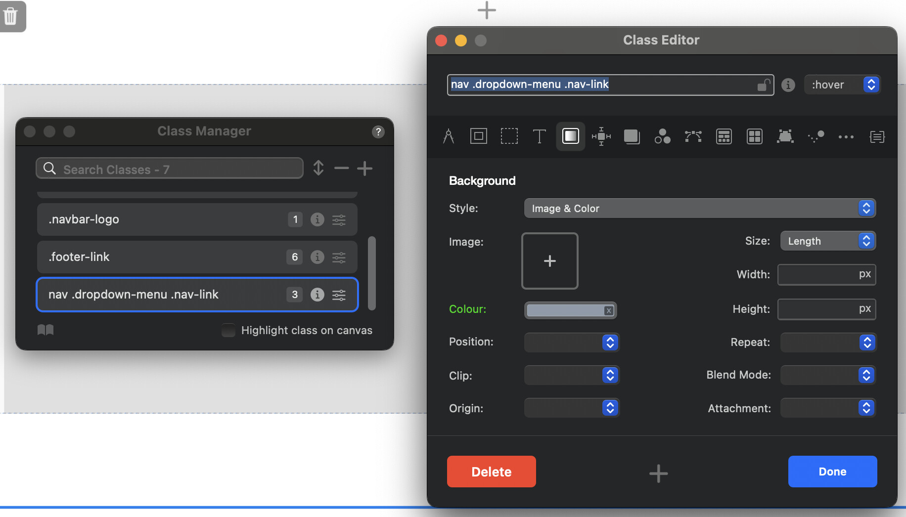 First, open the Class Manager. Then, add the “Navigation Dropdown Links” class. To do this, raise the Class Manager from the lower right corner of Blocs {-}.