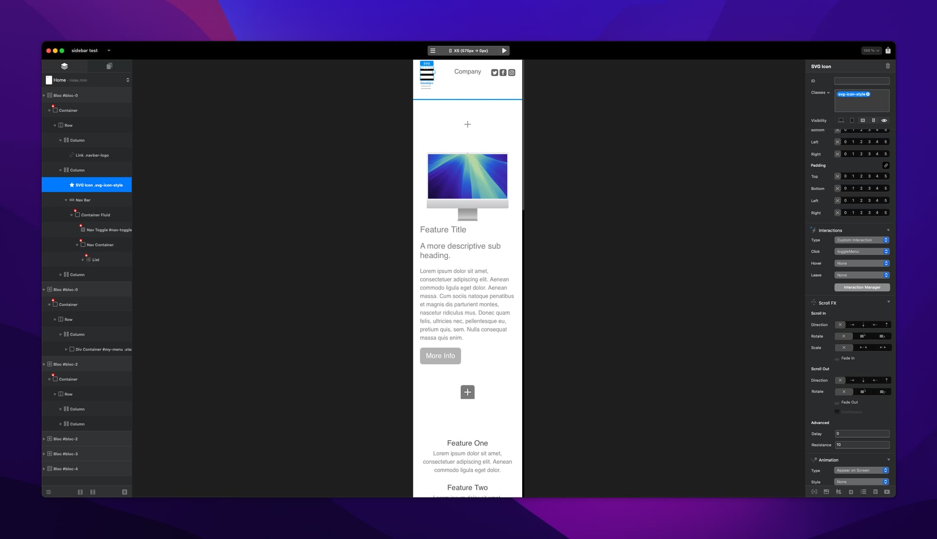 In the interactions menu on the right hand side for my icon, I have added a custom interaction and a click interaction and selected my Interaction we just created in the Interaction Manager called ‘toggleMenu’. This means when the hamburger icon is clicked, and interaction will take place, which for us is opening and closing a menu.