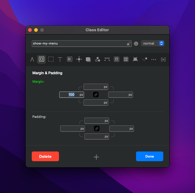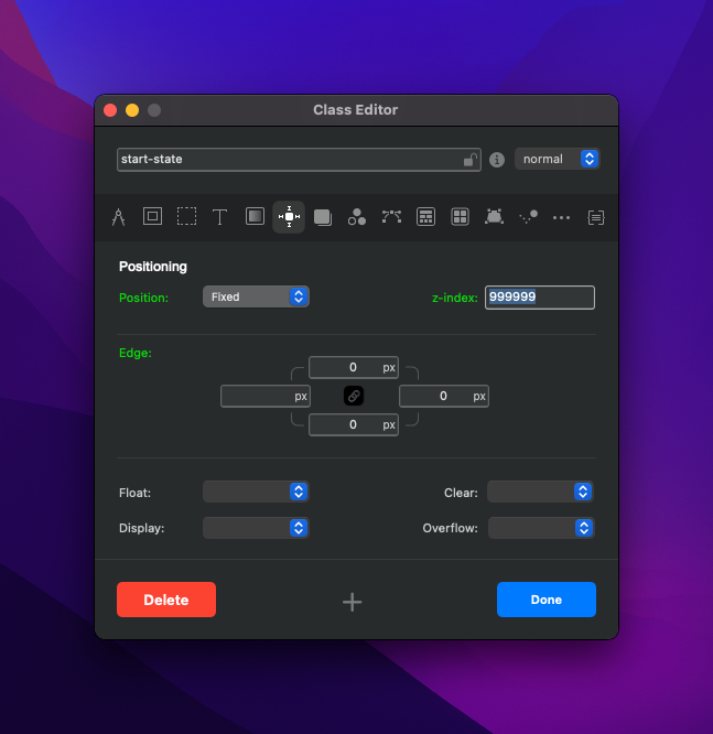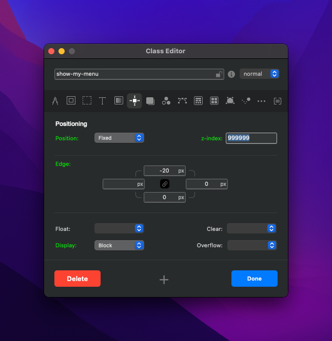 I haved added the position as fixed, the z-index the same and display as a Block. I’ve also added a top edge of -20 px, so that the menu is aligned to the top of the screen and the right and bottom edge are set to 0.