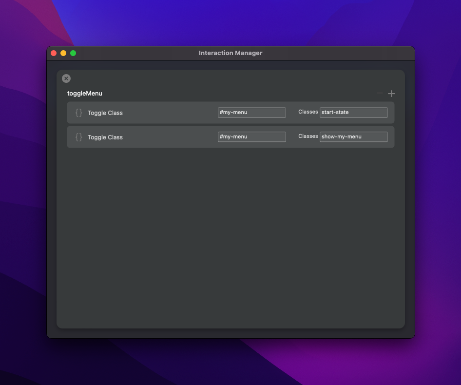 Ive added, two Toggle Class interactions. First one is for the start state-class and next is for show-my-menu class. Both have #my-menu which is a reference to the ID name of our Div-container which we added in a previous step. This is basically where our menu has been created.