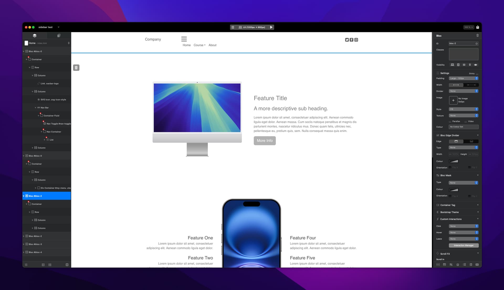 I then added a 1 column bloc & a Div Container bric to the main center bloc and gave the div container an ID ‘my-menu’.