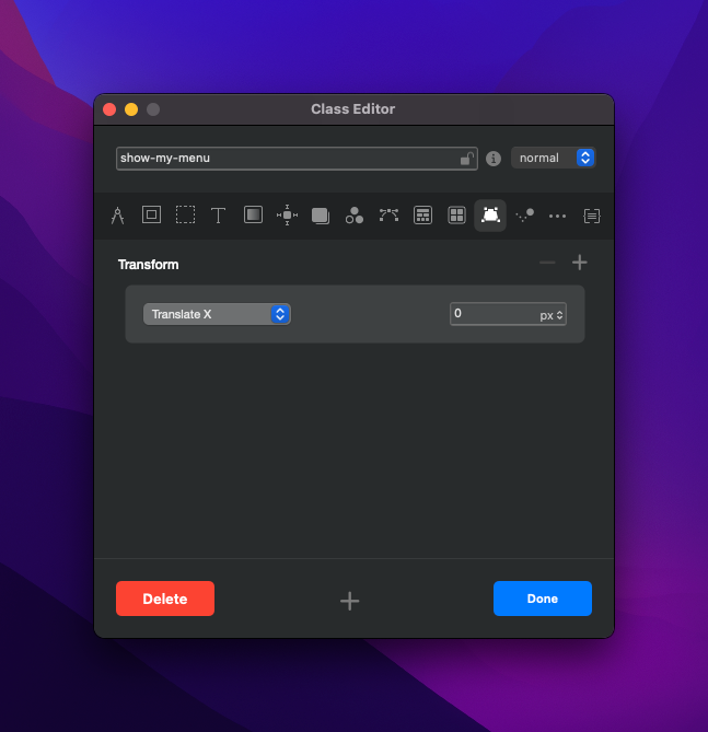 I then added ‘Translate X’ with a value of 1000px. This makes sure the menu stays off the canvas to the right. If i were to change it to a minus value, it would place it off the the left, so this could be used if you want the menu to fly in from the left rather than right.